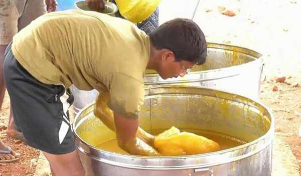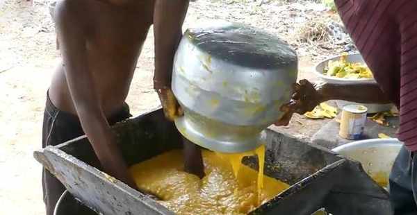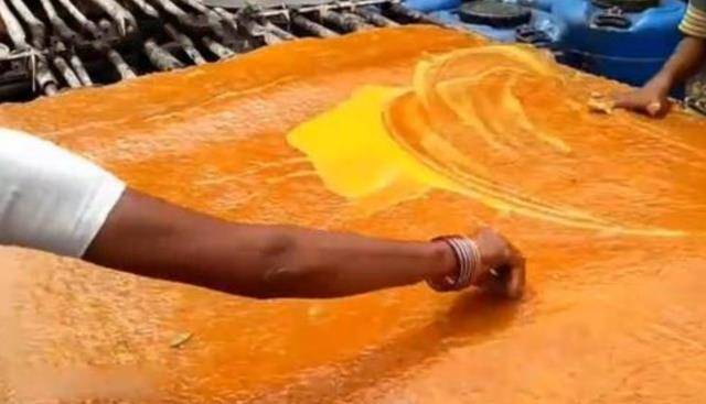 能够看到,印度人在制作芒果干的时候就是直接用手搓,就像是在洗手一样,他们通过这种方式把芒果碾碎,下一个步骤就是充分的搅拌,确保芒果肉已经软烂成泥,加入糖分再次搅拌,之后再将其倒在一个大平面上晾干,然后大家熟悉的芒果干就出现了。