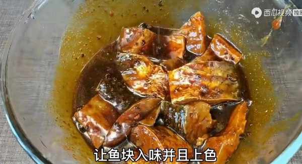 将所有的调料均匀的涂抹到鱼块上,把鱼块放在里面稍微腌制一下,腌制的时间大概是在半小时左右,让鱼块入味并且上色。搅拌的差不多,把之前切好的葱姜蒜、盐一起加进来,经过这样的腌制过后,这鱼啊,特别的入味,鲜香好吃。