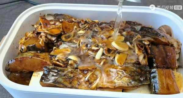 将鱼块全部铺在锅里之后,腌鱼的料汁也别忘了一起撒进来盘中,剩下的葱姜蒜和料汁全部淋在鱼上。接着咱们就可以准备开火了,开火之前千万别忘了往里面淋上点啤酒。