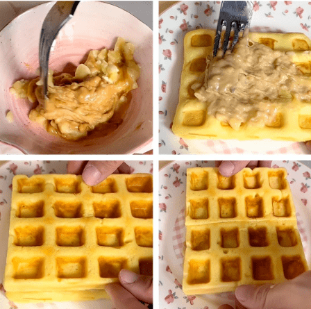 搅拌均匀,涂抹在一张华夫饼上,再盖一张华夫饼,然后对半切开。