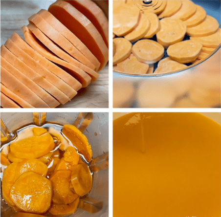 红薯洗干净、去皮,切薄片,水开大火上锅蒸15分钟,蒸熟的200克红薯倒进料理机,加1000克水,炸2分钟,红薯汁榨好后滤一下,然后把过滤的红薯汁倒进大一点的面盆,先倒600克。