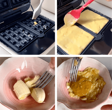 早餐机上刷一层黄油,倒面糊,用工具把面糊铺平,盖上盖子计时3分钟;剥半个香蕉,把香蕉碾成泥状,加1勺花生酱。