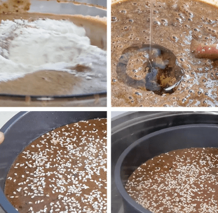 每加完1次面粉就要把面粉和红枣糊糊翻拌均匀,搅拌到没有干面粉后加40克玉米油,再次翻拌均匀,把面糊倒进模具中,震荡几下排出大气泡后撒入适量白芝麻,开水上锅中火蒸30分钟。