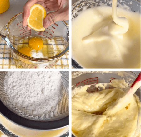 往无水无油的杯子里面打2个鸡蛋,加适量白砂糖和柠檬汁;用打蛋器低速打发,持续打发3分钟,打发至颜色变浅,提起来纹路不消失;往里面筛入25克低筋面粉,搅拌均匀后加15克玉米油,再次搅拌均匀,搅拌的速度要快一点。