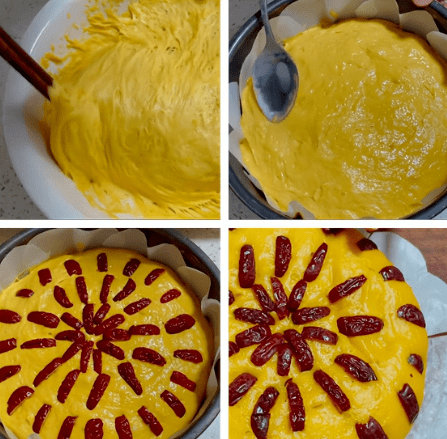 醒好的面团用筷子搅拌几下,排出里面的空气,然后倒进电饭锅内胆中,用勺子把面糊压平整后往上面铺一些切碎的红枣;盖上保鲜膜在蒸锅里静置10分钟后用冷水蒸40分钟。