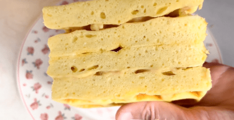 把搅拌好的面糊倒进模具中,压平整后震两下排出里面的空气,放冰箱冷藏3-4小时,冷藏到凝固,在案板上脱模,切的时候刀上要提前蘸一点清水,把红薯糕切成小块,可以往上边淋一些酸奶吃,也可以往上边淋一些桂花蜜,两种吃法都很好吃。