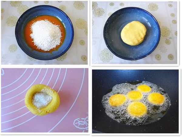 做法:南瓜蒸熟、加水用1:1的比例,放入料理机搅打成细腻的糊状;然后放入糯米粉、和成微软的面团。揪下一块南瓜糯米粉面团,团圆做出碗状,放入一汤勺拌好糖的椰蓉,收口后轻轻压成小饼状。锅热油,油五分热的时候放入炸糕炸,两面翻动、炸熟即可。