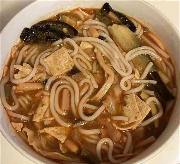 汤头偏干咸,辣椒油辣,花生起泡颗粒有嚼劲但不油腻,四季豆厚实,酸竹叶脆而不丝。我添加了所有的成分。就个人而言,这是非常苛刻的。不喜欢吃辣的可以加一点辣椒油。如果咸,加更多的水。我加了蘑菇、茄子和卷心菜,还有很多蔬菜。