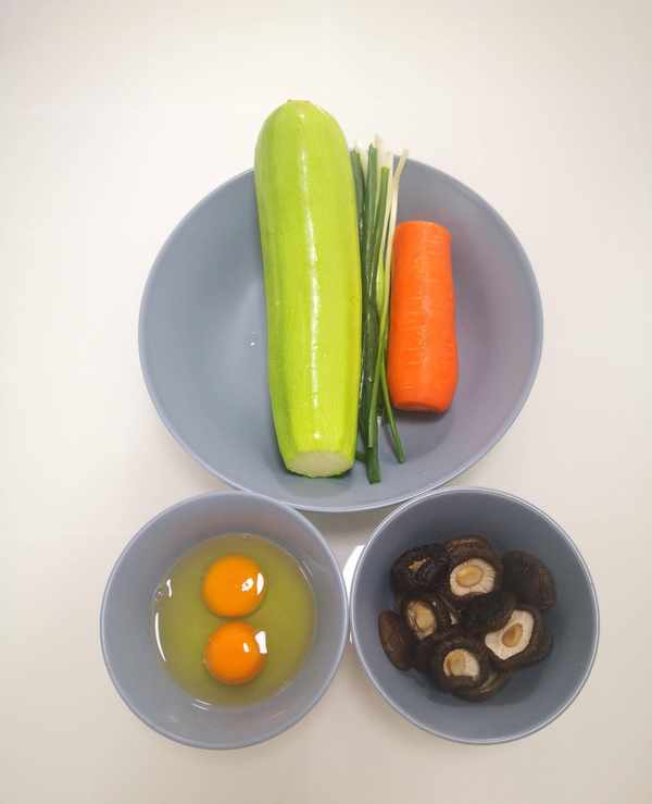 准备中等大小的西葫芦、大葱、胡萝卜、鸡蛋和香菇。我制作了以下数量的12个锅贴。