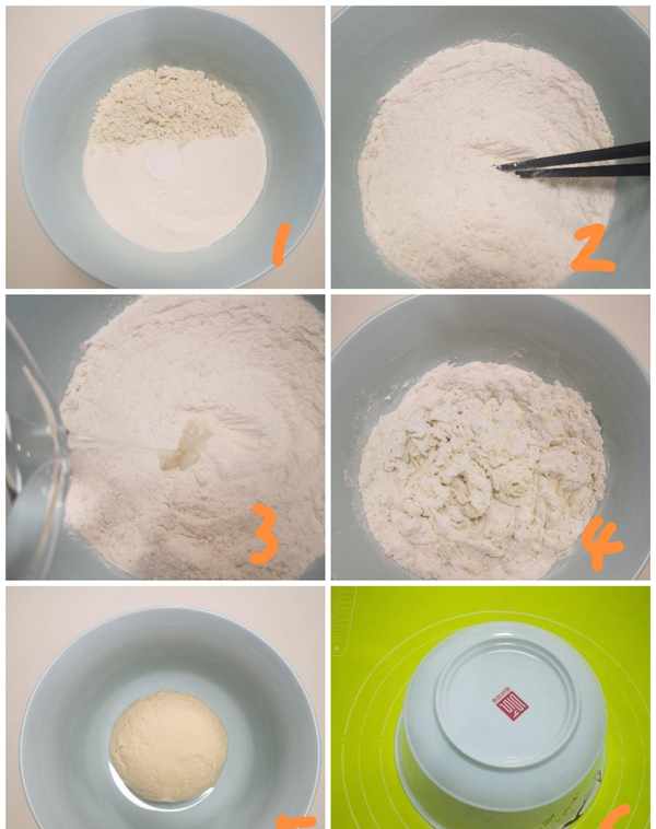 5~6。用手将面团揉成中软至硬的面团。你不需要揉得很顺利。将大碗倒置,静置20至30分钟。