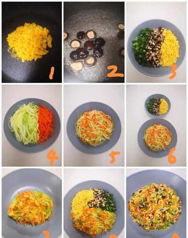 4~7。西葫芦和胡萝卜切细丝,加盐拌匀,腌10分钟,挤干水分再切短一点。