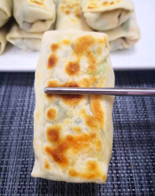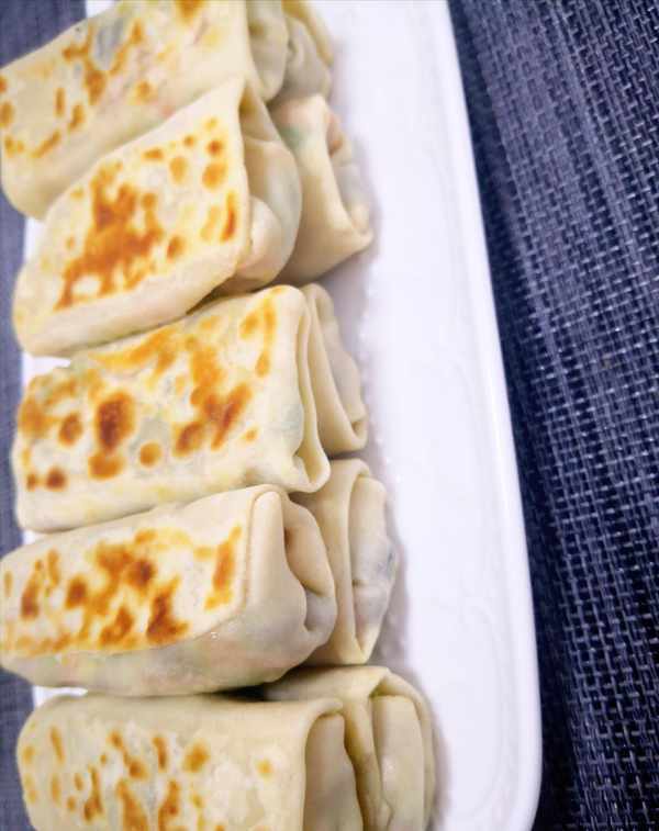 2.这个锅贴要少油又脆又好吃,关键是皮一定要很薄,越薄越好。