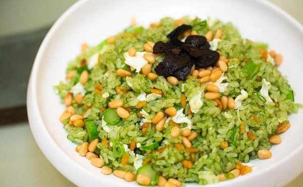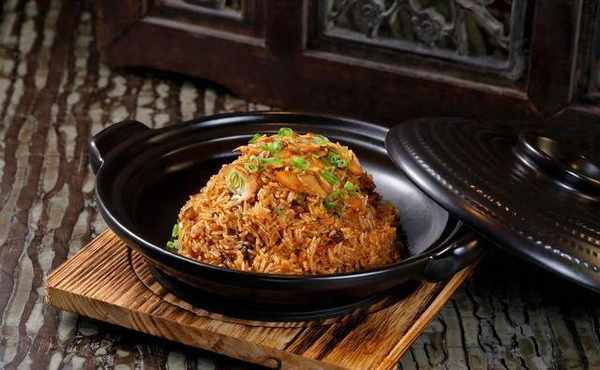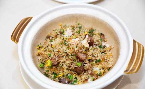 另一道「砂窝炒饭」,基哥则以黏度较低、硬度较足的青森纯白米来炒。洗米后即蒸,再加入叉烧、瑶柱、虾仁、瑶柱汁、火腿汁等炒至饭底微焦即成,不但大家,连他自己都非常满意。