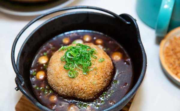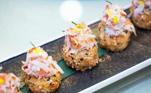 师傅这道「鳕场蟹肉芝心米饼」卖相已经很吸引,没想到除了蟹肉和芝士,原来还有豆腐在内,却带点柚子清香!师傅说选用了北海道梦美人米,先浸后蒸,再加入豆腐、车打芝士、虾胶及蟹肉搓成球,沾上黑白芝麻后,炸成金黄米饼,再配以鳕场蟹肉、柚子肉、青柠汁和白饭等制成莎莎酱,外脆内软,清香美味,没半点遗和感。