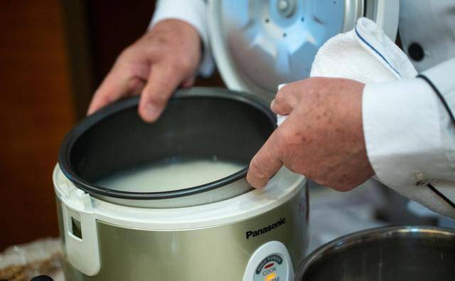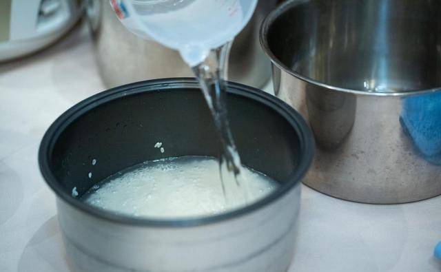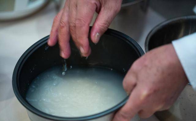 1.洗米:不用又搓又磨,破坏米粒。只需加水,用手轻轻搅拌5至6个圈便可,倒去米水便可。