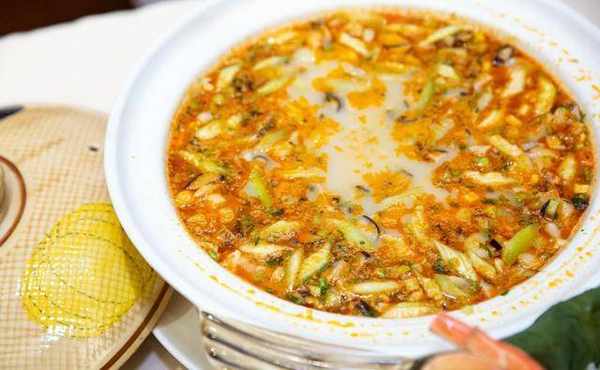 师傅的另一道菜式「龙虾汤泡东瀛香米」,同样以北海道梦美人米浸水蒸熟,部分饭粒加进龙虾汤浸泡,龙虾汤是用虾壳磨粉,加入土芹等熬2小时而成,部分饭粒则油炸至金黄香脆。粒粒饭均充满浓郁虾味,又脆又甜。