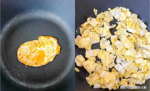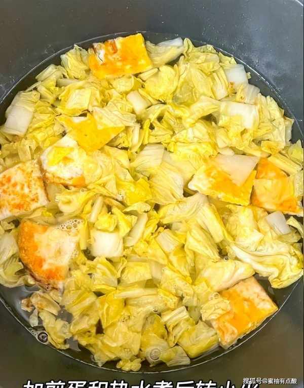 第五步:锅内留少许食用油,倒入一些娃娃菜炒软,放入事先煎好的鸡蛋,放入几碗开胃菜,将汤烧开。