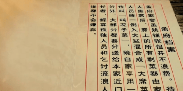 孟府大席菜真心不是大席菜,就是一碗剩菜,孟府菜是极其奢华的,一桌食客七到八人,菜有三十道之多,吃不了怎么办?剩菜是不扔的,混倒入一个盆子中,自己吃一些,分本门邻居吃一些,有路过乞讨者分一些,叫“叫化子菜”,是大席上下来的菜,也叫“大席菜”。