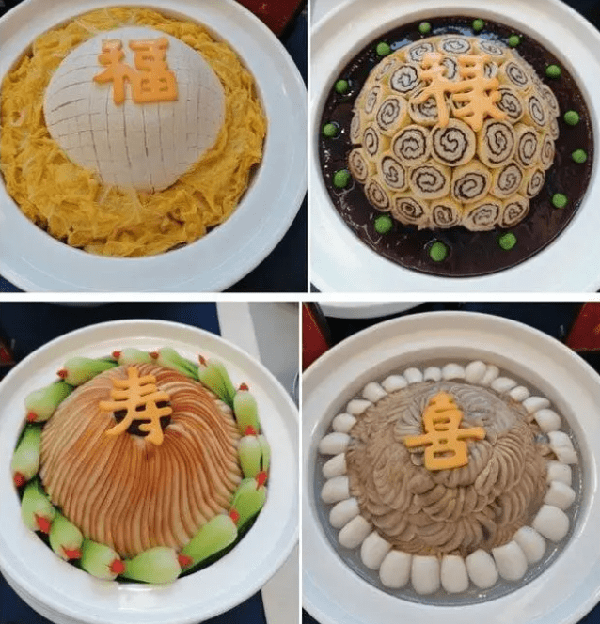 扣碗是鲁西南地区的常用做菜方式,孟府扣碗有四扣六扣八扣,以四扣碗为多,通常用的主料有扣肉、扣鱼、扣鸡、扣卷尖等菜品,料大致固定,也随时令走加新鲜菜品,通常菜品初加工好,上屉蒸一小时,反扣入盘中,浇上芡汁,再封上用鸡蛋皮刻好的福禄寿喜,味道不用说有多好吃了,单是这装盘就让人不忍动筷子。