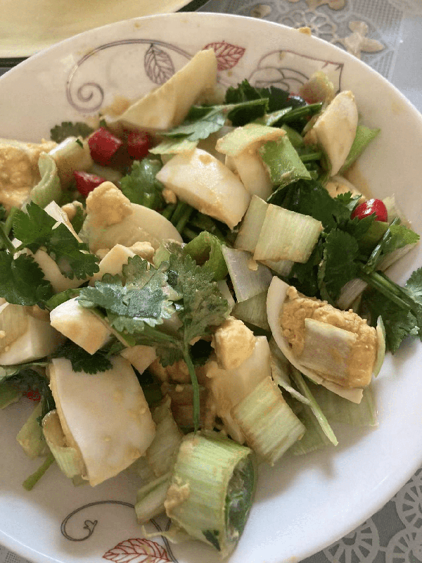 挤好的蛙鱼,放入蒜泥、盐、醋、酱油、香椿咸菜,腌胡萝卜丝、韭菜花酱,喜辣的来一点辣椒油,口感爽滑、味道鲜美。一碗蛙鱼、两块菜煎饼,这就是邹城人的乡情记忆,是对家无限的爱。
