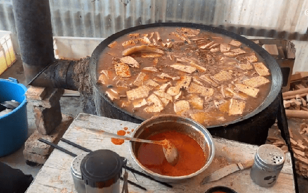 邹城、曲阜的水质特别好,做出来豆腐更优质,这豆腐切成块,铁锅中加料薰香、颜色黄,大集的早上,就支上大锅,锅中加大料、盐、五花肉、猪腰子、猪前颈肉,慢火咕嘟着,越久越香,香飘四方,这就是邹城接地气的小吃薰豆腐。