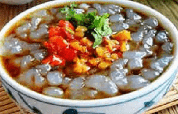 邹城蛙鱼不是鱼,是一碗面食,外形上和陕西的“面鱼儿”有些相近,做蛙鱼多用地瓜淀粉,按比例(通常1:6)调成糊,加入锅中小火烧开,用勺子挤压的到漏勺里,挤到凉开水中,蛙鱼就成型了,状如小鱼,形似蚕肾,又如在水中的小蝌蚪,故名蛙鱼。