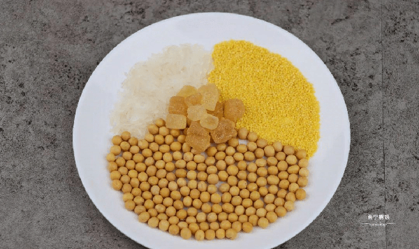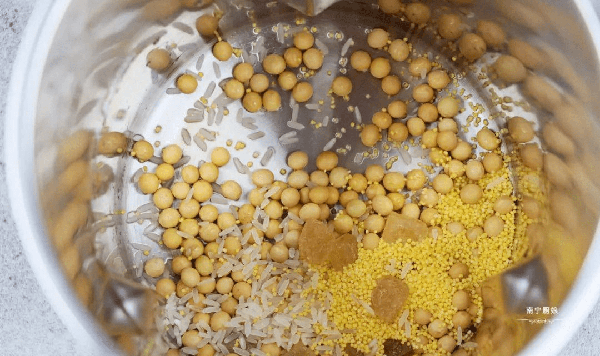准备食材:黄豆150克,小米50克,大米30克,黄冰糖适量。
