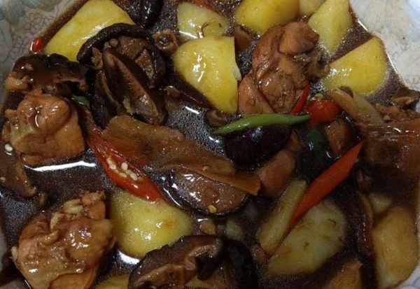 3,鸡块炒好之后,把香菇和土豆块一起到进去,翻炒几下,然后倒入高压锅内,加入适量的水,盖上锅盖大火炖五分钟左右。