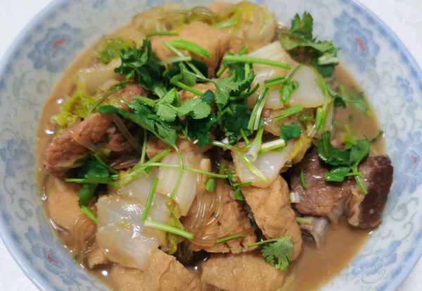 4 ,排骨煮好后,倒入白菜和油豆腐,炖五分钟,最后把粉条放进去,煮熟之后,放盐调味就可以出锅了。