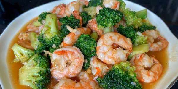 3、热锅放油,放入虾仁翻炒一下,然后放入西兰花,倒入调好的料汁,翻炒均匀,大火收汁就可以了。一份营养美味,低脂低卡,西兰花炒虾仁就做好了。