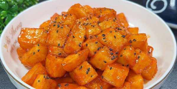 4、锅中留少许的底油,然后把糖醋汁倒入锅中,开大火熬至浓稠。一直熬至起大泡,变得粘稠就可以了。然后舀一勺出来,再把土豆丁放进来,淋在上面,快速翻炒均匀,就可以关火出锅了,再撒上一点黑芝麻点缀一下。