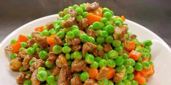 3、锅里水开,加点油,再下入豌豆,水开倒出以后一定要立即冲凉,防止变黄。再将料头葱给它爆香,下入牛肉快速炒散,来一点老抽,调一下颜色。下入豌豆,翻拌均匀,炒干豌豆的水分。调味加入盐,味精,白糖,一点点水,再次炒拌均匀,最后来一点水淀粉,勾个芡,即可出锅装盘。