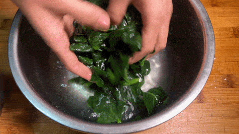 7.将焯过水的菠菜挤干,放在砧板上