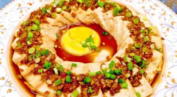 1、豆腐洗净后,切成长5厘米、宽3厘米、厚0.5厘米的厚片。豆腐摆盘,中间放一个鸡蛋,放入蒸锅,大火蒸熟。蒸完再蒸8分钟,蒸豆腐和鸡蛋。