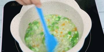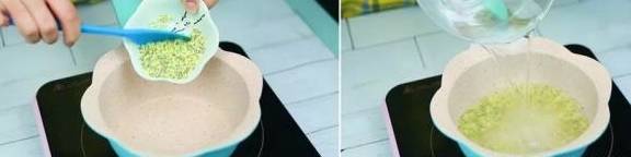 ▲步骤一:将准备好的小米倒入锅中,再加入适量清水,开火熬煮,煮至七成熟即可