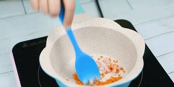 ▲步骤八:辅食锅中倒入少许食用油,再倒入切好的里脊肉和胡萝卜