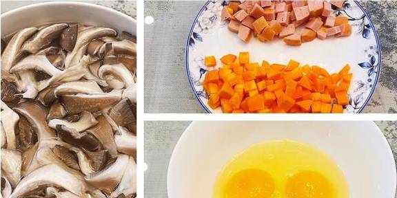 蘑菇的营养丰富味道鲜美,是高蛋白、低脂肪,富含人体必需氨基酸矿物质,维生素和多糖营养成分的健康食材,经常吃能促进人体对其他营养的吸收,蘑菇中蛋白质的氨基酸组成比例比牛肉更好。第一步:我们将蘑菇用流动的水清洗干净,撕成小块,再将胡萝卜去皮切成小丁(胡萝卜米球一般是要去一下皮的,因为现在超市卖的胡萝卜个个特别光滑,不像米球小时候吃的那种胡萝卜,表皮带土还坑坑洼洼的,所以为了健康还是将外皮去掉),火腿两片切成小丁,并切适量的葱花、蒜末备用。