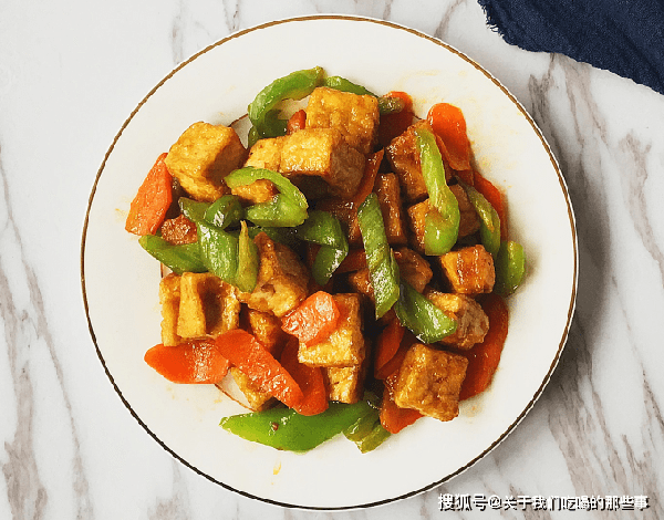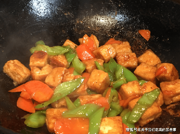 3、起锅烧油,放入葱姜蒜爆香,倒入胡萝卜、西蓝花翻炒1分钟,倒入煎好的豆腐块,倒入料汁烧1分钟,淋入水淀粉勾芡,翻炒均匀后即可出锅。
