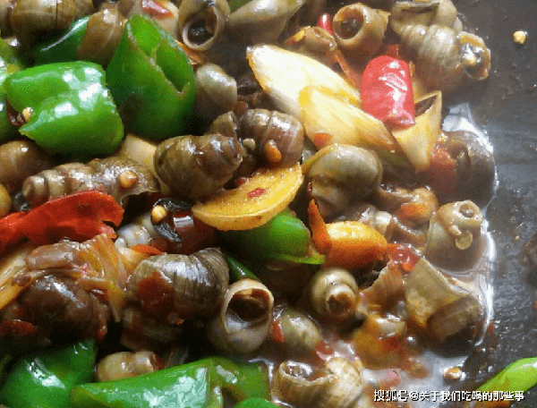 2、葱切段,姜切丝,蒜切片,小米椒切圈,青辣椒切块。起锅烧油,放入葱姜蒜、小米椒炒香,加入一勺豆瓣酱炒出红油,倒入田螺大火翻炒1分钟,淋入料酒去腥。