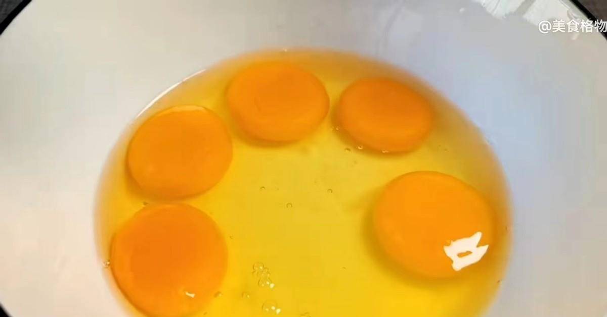 首先,准备五个傻蛋,打入碗中。这些是我家乡养的一只母鸡下的蛋。它们虽然个头小,但非常好吃。如果你没有它们,你可以使用普通鸡蛋。然后在碗中加入少许白醋。首先,它可以去除腥味。其次,它使鸡蛋特别新鲜和柔软。第三,白醋可以防止后面加入的其他食材氧化变色。