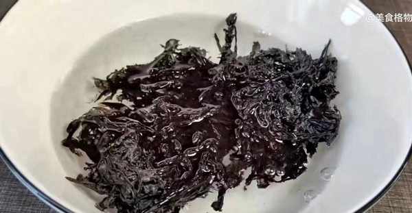然后准备一个大一点的碗,里面放一大块紫菜,倒入温水泡紫菜至软。浸泡两分钟左右,待水藻满水后,用手轻轻抓起洗净,倒掉脏水再用清水冲洗一遍。如果你买的是一次性水槽,也可以跳过这一步。