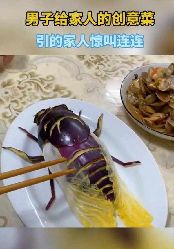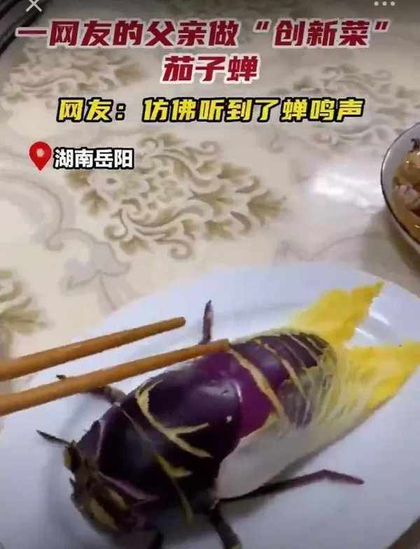 岳阳女网友湖南发布视频分享父亲的创新菜“茄蝉”。照片上,她的父亲将一个紫色的茄子切成蝉的形状,两边放着两片煮熟的白菜叶。像翅膀。