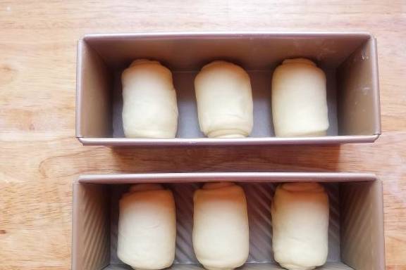 8、将它由下而上卷起后,摆放到300克的小吐司盒内,面卷摆放的时候,彼此之间要记得留点空隙,利于发酵。