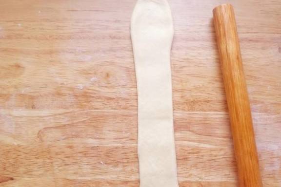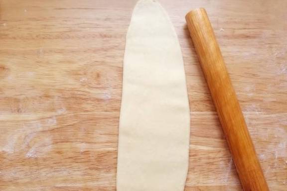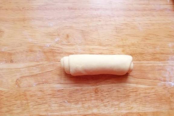 7、卷好后,把面卷竖过来,用手拍扁后,再次将它擀开,第二次擀开的时候,尽量擀得长一些,这样卷起的层次越多,烤好的成品组织撕起来也就越好看