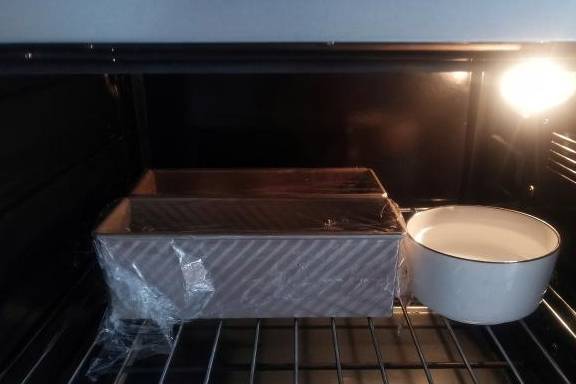 9、吐司盒顶部盖上保鲜膜,然后送入烤箱,烤箱内放碗温热的水,关上门后,选择发酵档