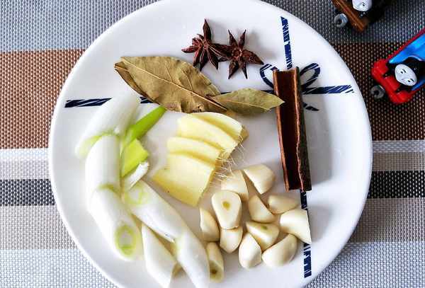 以下是今天做猪蹄所要用到的大料:桂皮、八角、香叶、葱段、姜片,大蒜粒;