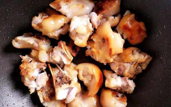 4、倒入沥干水份的猪蹄,快速翻炒给猪蹄均匀的裹上糖色;