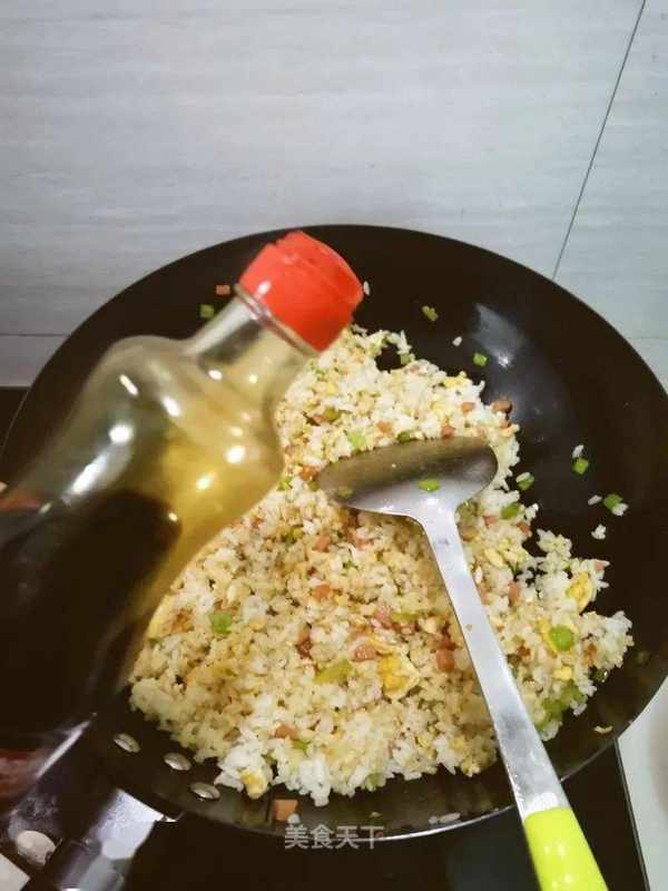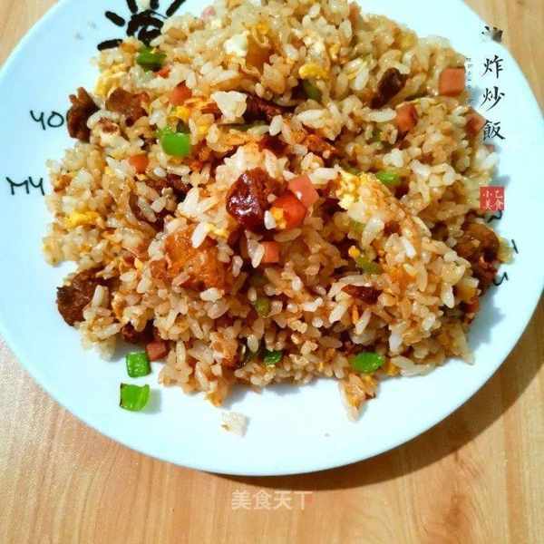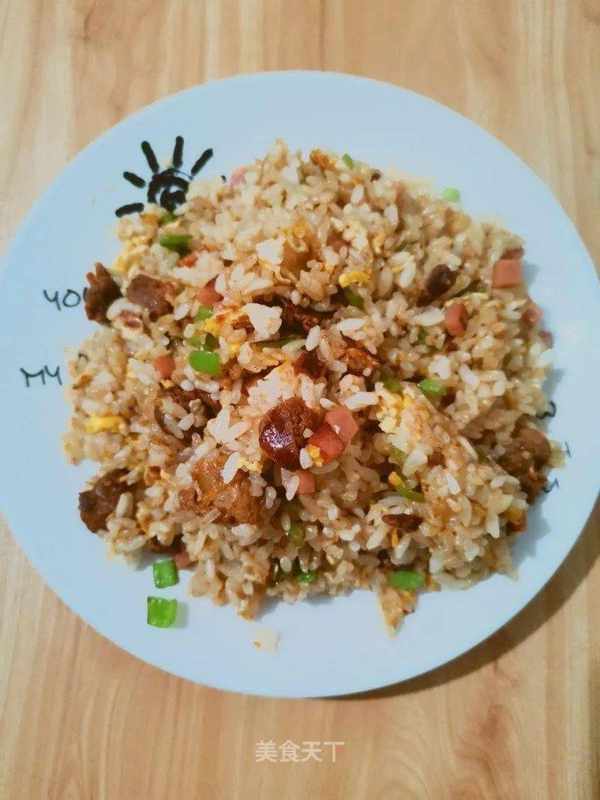 米饭1碗、猪油1勺、火腿少许、青椒1个、鸡蛋2个、油炸少许、生抽1勺、老抽半勺、蚝油1勺、盐1勺。