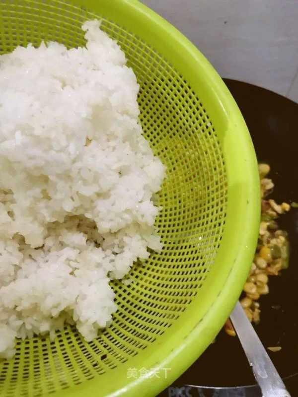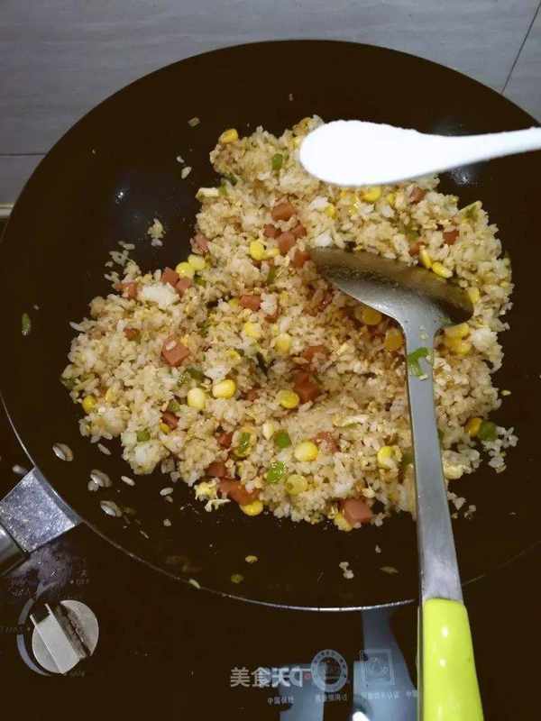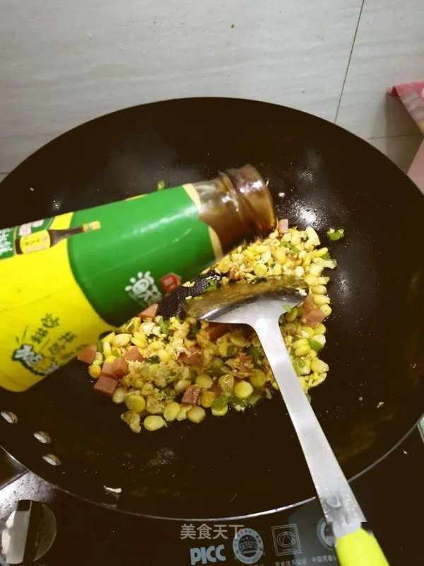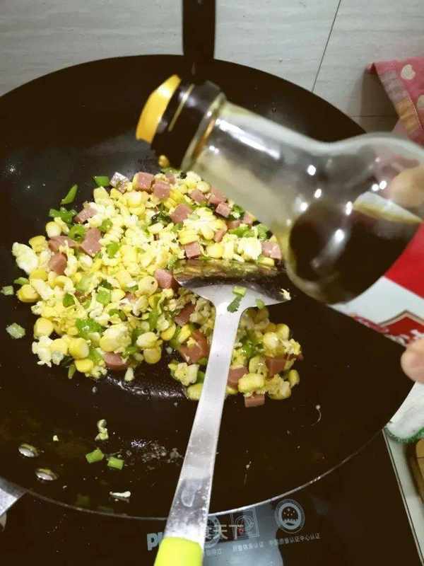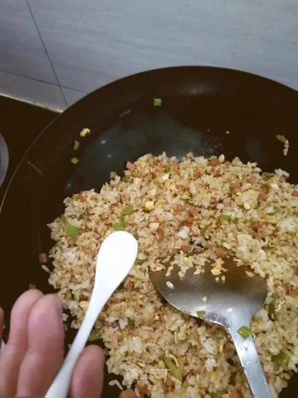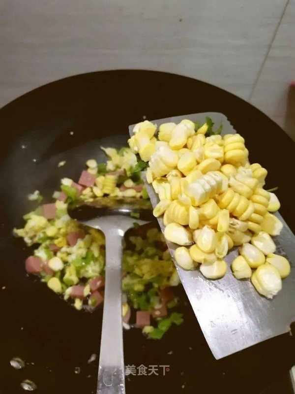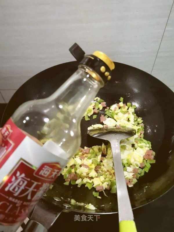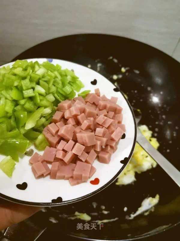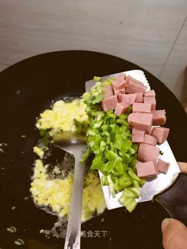 4. 放入提前备好的火腿粒,青椒粒煸炒。