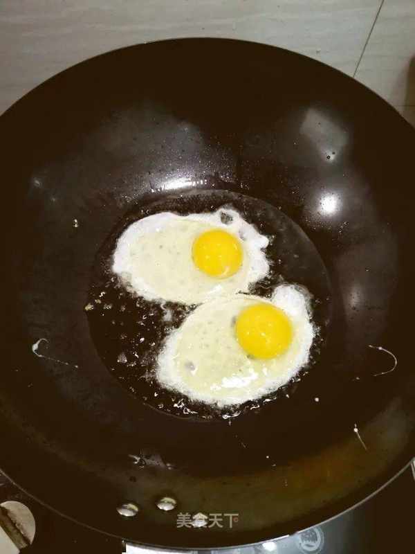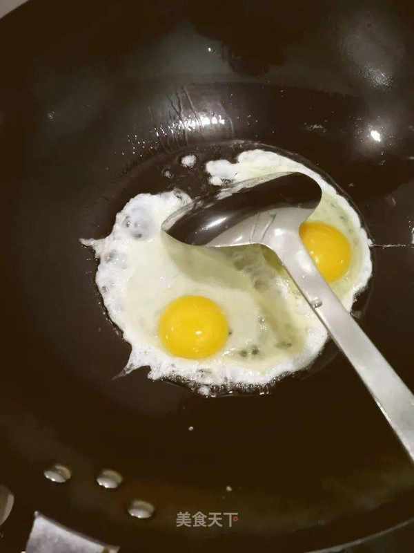 5. 锅中油预热,打入两个鸡蛋,炒散。